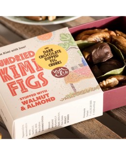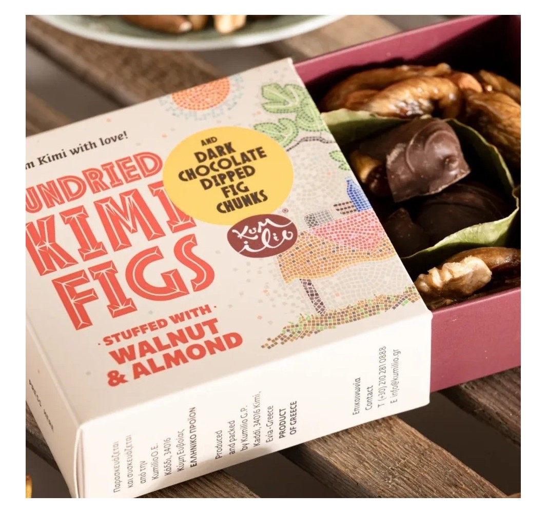 Zestaw fig Kimi P.D.O.: w aromatycznej ciemnej czekoladzie, z migdałami i z orzechami włoskimi – smak Grecji w eleganckiej formie.