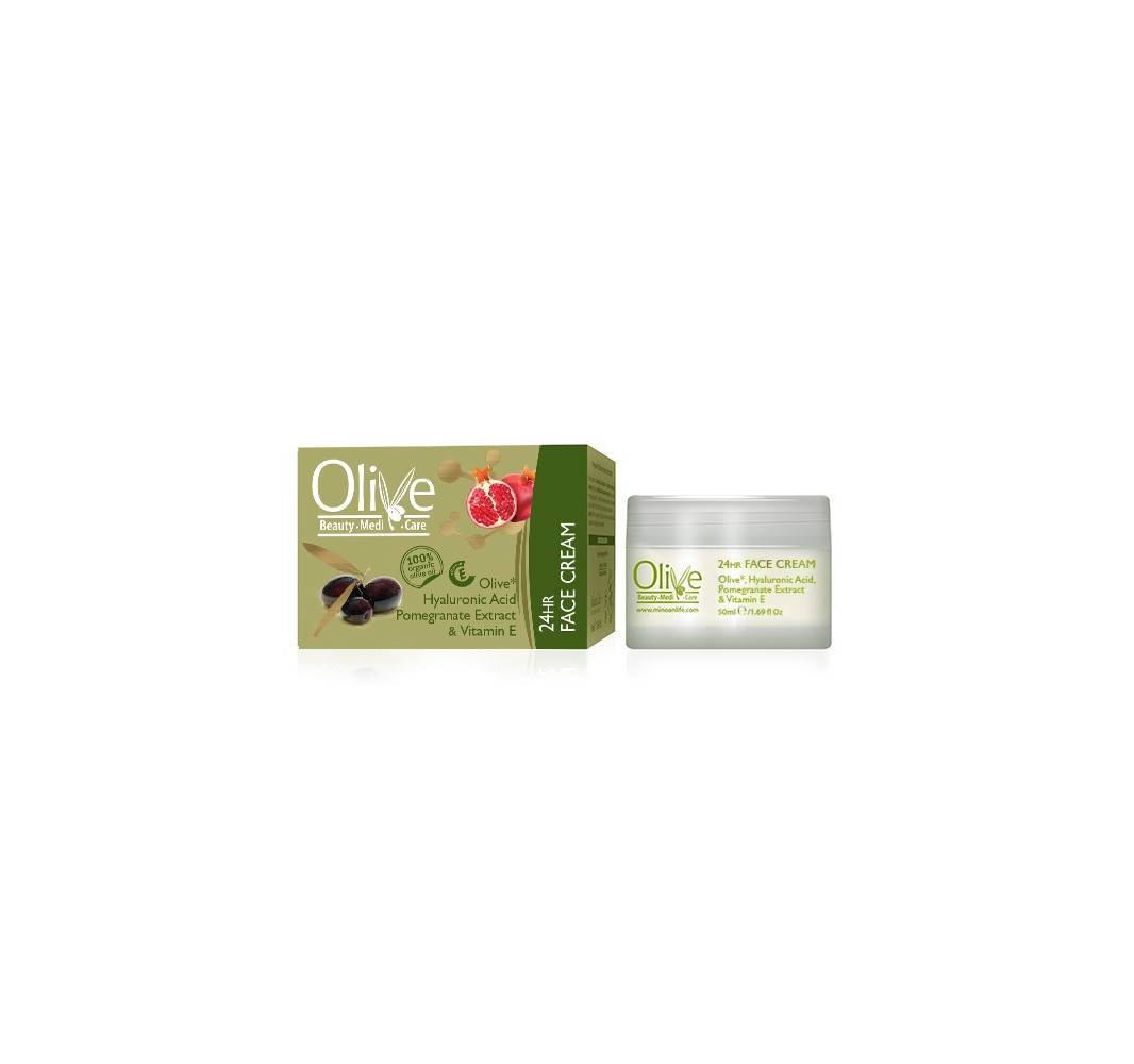 Nawilżający krem do twarzy z oliwą z oliwek, kwasem hialuronowym, olejem z granatu, ekstraktem z granatu, witaminą E i prowitaminą B2, odpowiedni nawet dla najbardziej wymagających typów skóry.