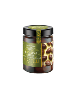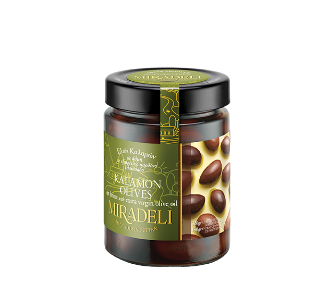 Wyraziste oliwki Kalamon o ciemnofioletowej barwie i lekko winno-owocowym smaku. Naturalne, bez konserwantów, w zalewie z oliwą extra virgin i oregano. Doskonałe do sałatek i makaronów.