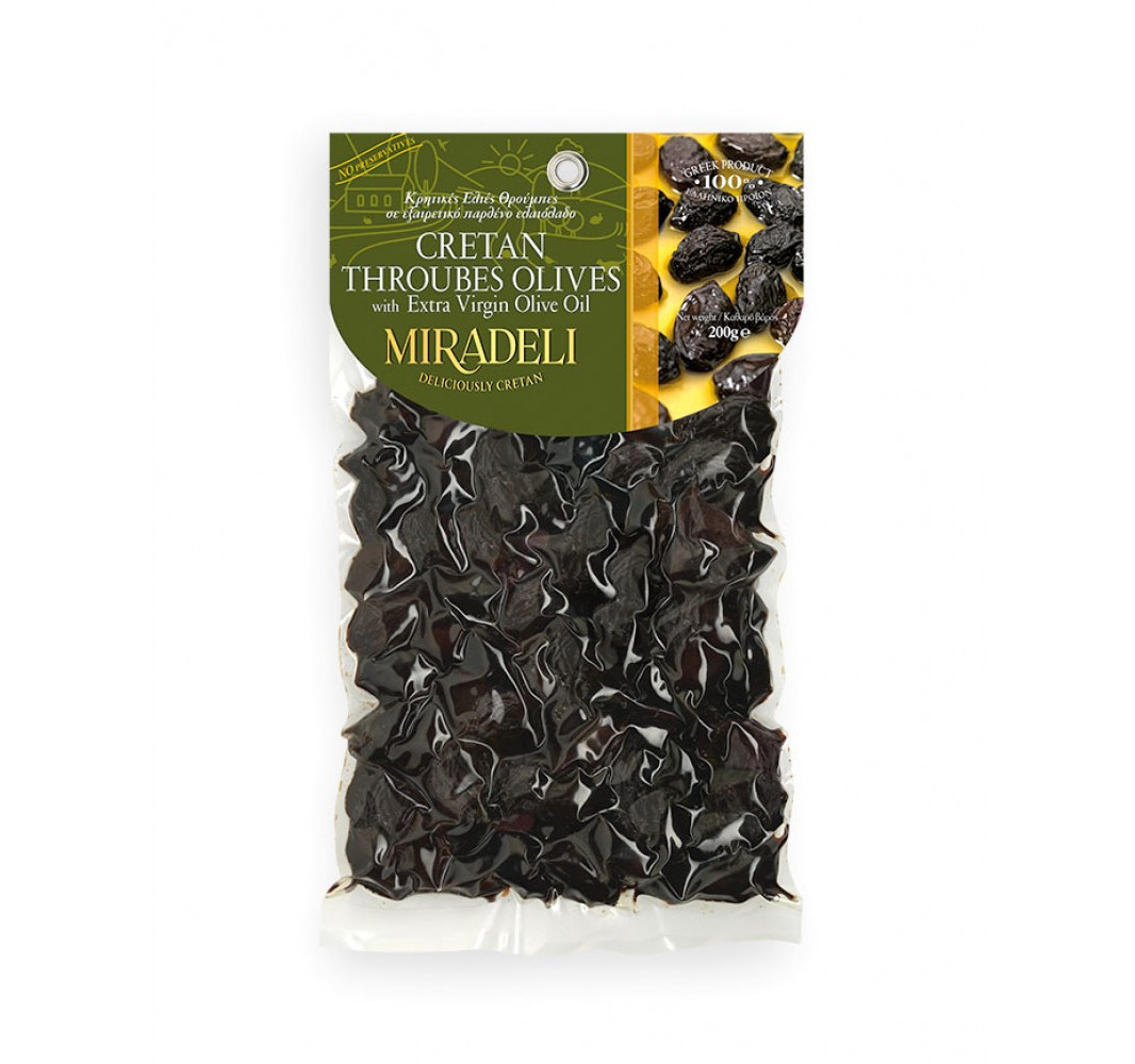 Naturalne czarne oliwki Stafidoelies – Throubes mają duże, mięsiste owoce. Wyglądają jak duże rodzynki, ponieważ są suszone na słońcu. W smaku słone i wyraziste, lekko przypominają wędzone śliwki. Zachowują wszystkie swoje walory smakowe dzięki naturalnej solance z dodatkiem oliwy z oliwek extra virgin.