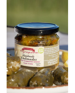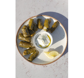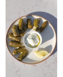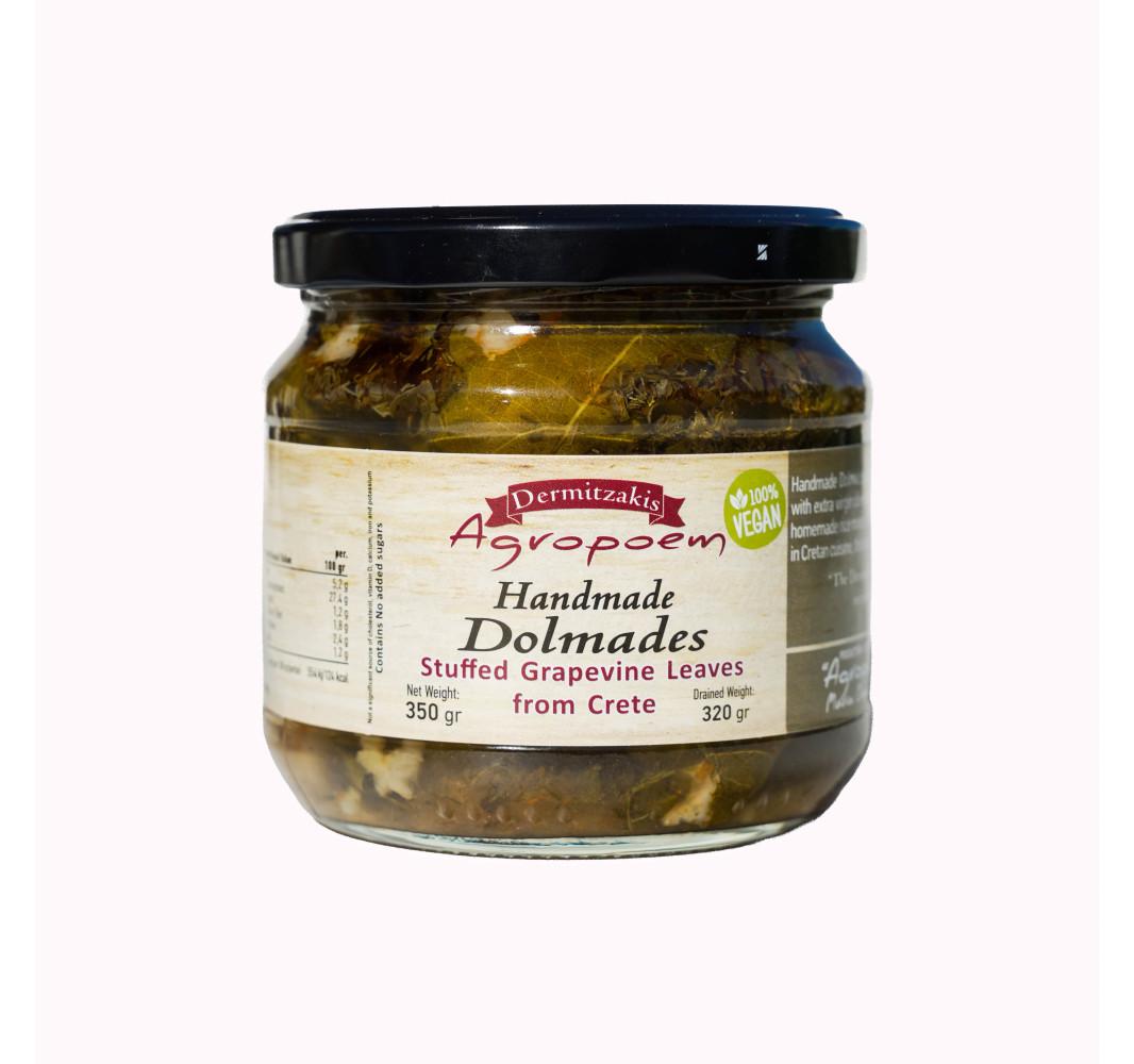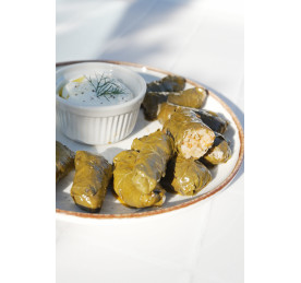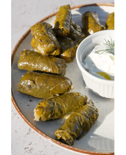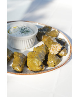 Dolmades to tradycyjne greckie gołąbki, przygotowywane ręcznie z delikatnych liści winogron. Ich wnętrze kryje aromatyczne nadzienie z ryżu, świeżych warzyw i ziół z nutą cytryny, a całość otula najwyższej jakości oliwa z oliwek.