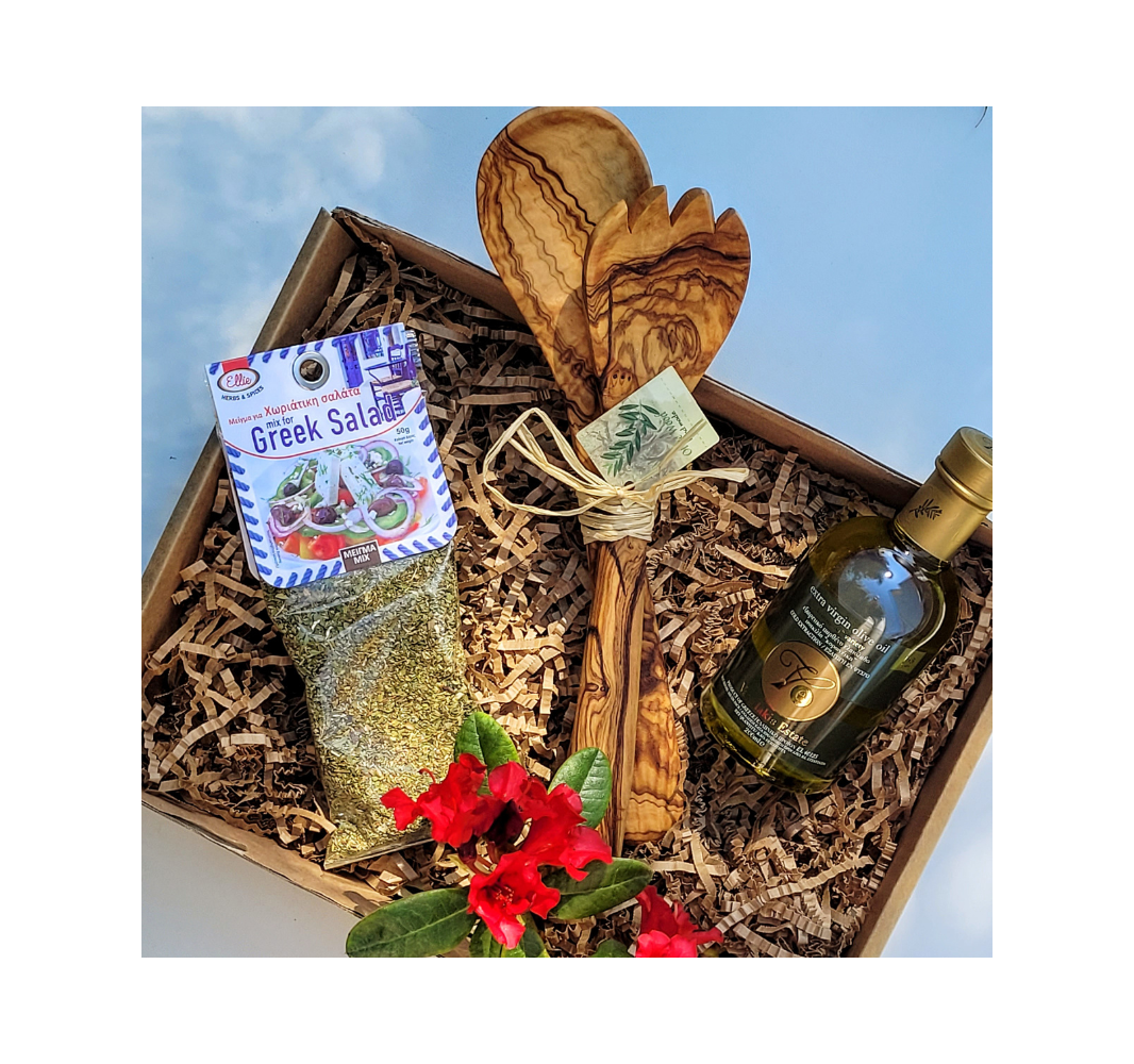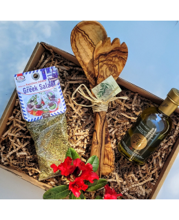 Unikalny zestaw prezentowy zawierający autentyczne i naturalne greckie delikatesy: limitowaną oliwę z oliwek Vassilakis Estate, mieszankę przypraw do sałatki greckiej Horiatiki oraz ręcznie wykonany zestaw łyżek do sałatki ze szlachetnego drewna oliwnego.