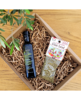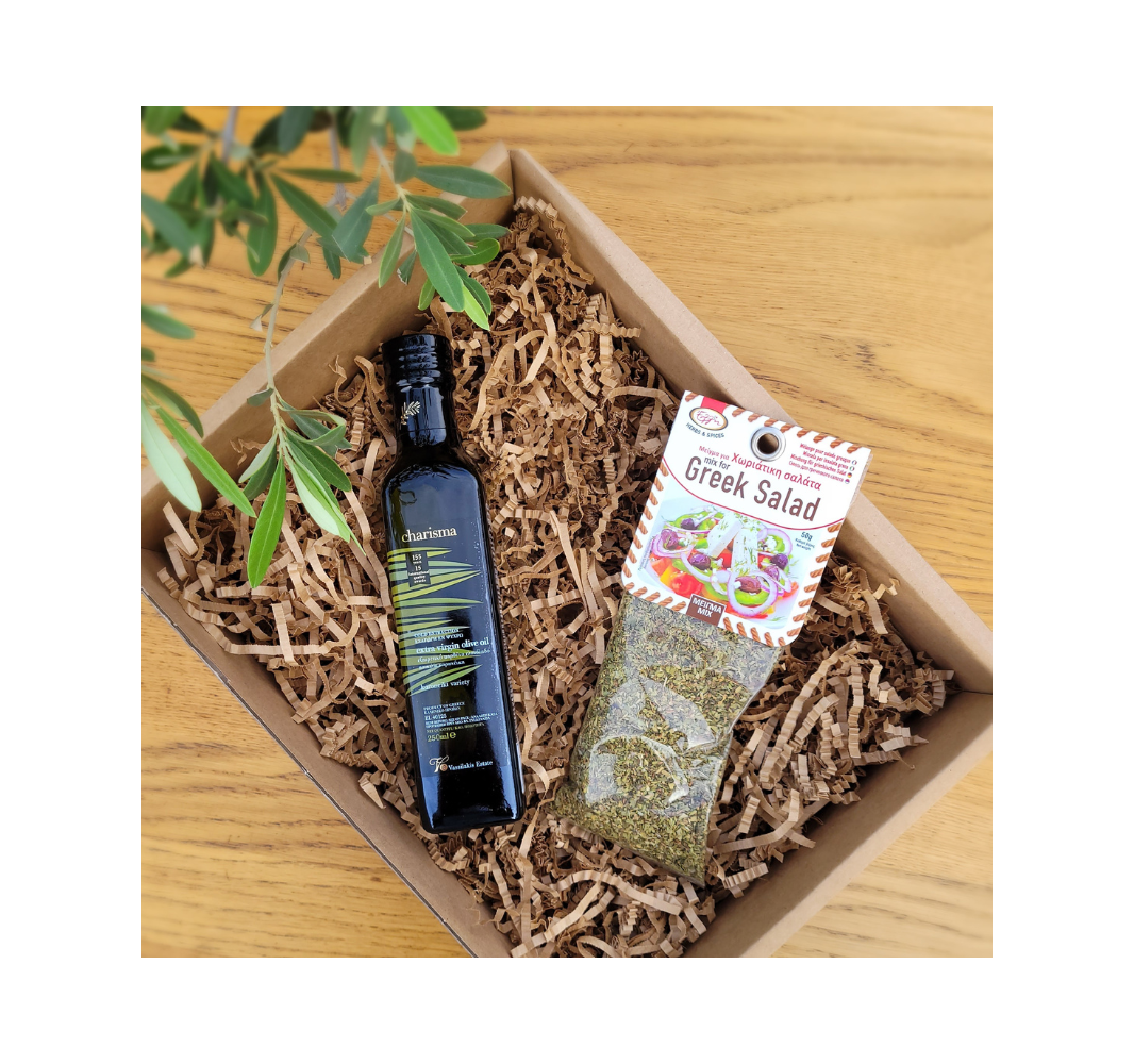 Zestaw do przygotowania greckiej sałatki. Zestaw obejmuje oliwę z oliwek extra virgin Charisma 250ml oraz przyprawę do greckiej sałatki.